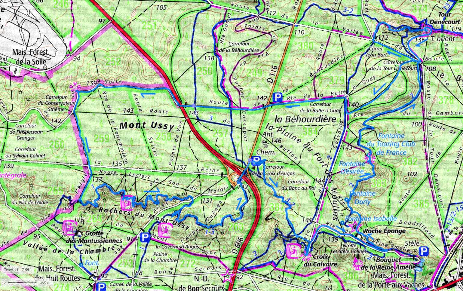 Départ du parking de l'auberge de la croix d'Augas, sur la D116 au nord de Fontainebleau (ville), pour une courte approche de la croix du Calvaire et sa vue imprenable sur la ville.